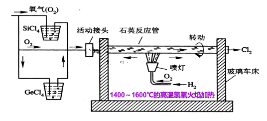 原料(氧气、四氯化硅、四氯化锗)进入高纯石英玻璃衬管后,在高温下(石英管外的温度为1400~1600℃)产生化学反应,反应生成烟灰状的玻璃粒子,它们沉积在玻璃衬管的管壁上。当沉积物达到设计所规定的厚度时,原料供给停止。