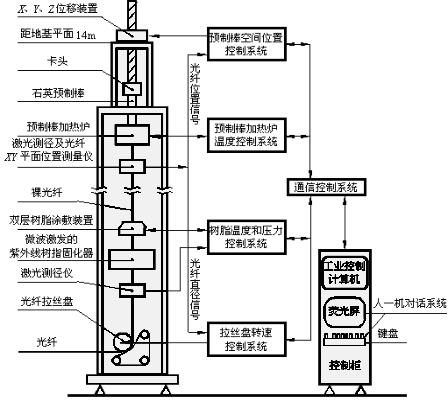 光纤预制棒被装入拉丝塔顶端的加热炉中,当炉温升至约2200℃时,棒体尖端的粘度变低,靠自重逐渐下垂变细成为直径125μm的裸光纤(纤芯直径约8μm),裸光纤直径由激光测径仪反馈控制,然后进入紫外光双涂层涂覆固化系统,再经过盘纤、检测等环节,一卷一卷的光纤就生产出来了。