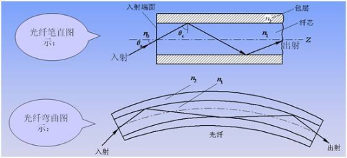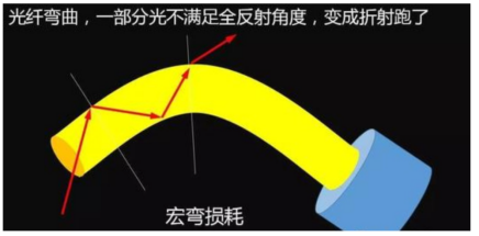 当光纤发生弯曲时,在弯曲部分,纤芯中传输光的入射角会相应减少,甚至小于临界角θc,这时就会有部分光折射进入光纤的包层部分,而无法被完全反射进入纤芯传输,导致光纤的衰减增加。